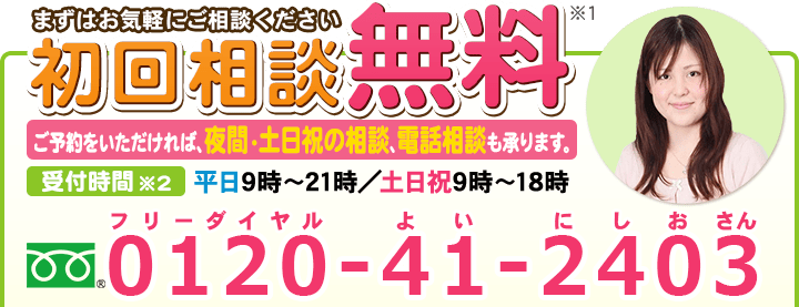 トップ共通バナー元※消さない 階層構造▼ 共通バナー元※消さない 受付時間 平日 9時~21時、土日祝 9時~18時 夜間・土日祝の相談も対応します (要予約) 0120-41-2403 お問合せ・アクセス・地図